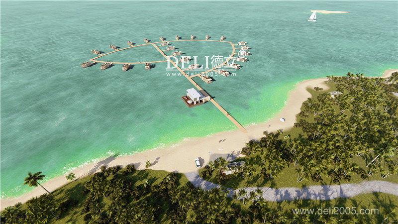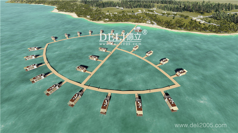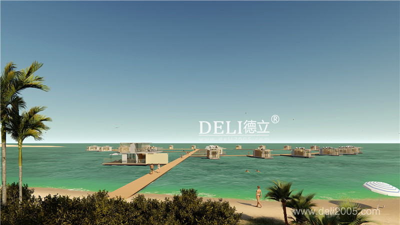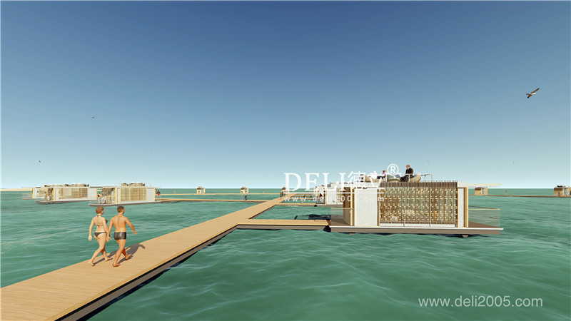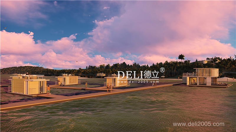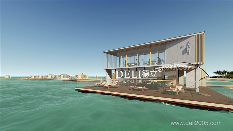 建筑采用的是輕鋼結(jié)構(gòu),從而降低重量,便于運(yùn)輸與裝卸。由于是裝配式建筑,在建筑整體的造型上,采用的是趨于規(guī)整的對(duì)稱(chēng)體塊,既保證了空間利用率也可以提升居住空間的舒適感。整體設(shè)計(jì)風(fēng)格主要以時(shí)尚簡(jiǎn)約風(fēng)格為主,考慮到是水上建筑,因此在材料的選擇上,運(yùn)用的是木材,木元素與水元素兩種自然元素結(jié)合,更加貼近自然。建筑的兩側(cè)用玻璃幕墻代替了傳統(tǒng)的墻體,玻璃的運(yùn)用可以最大限度的采光,室內(nèi)空間通透明亮,在視覺(jué)上可以給人一種寬敞的感覺(jué)。在玻璃幕墻的外圍,采用木制欄桿圍繞著,這樣的設(shè)計(jì)第一可以保留一定的私密性,第二可以美化玻璃幕墻,既保證了建筑私密性,又保留了建筑需要的通透性。