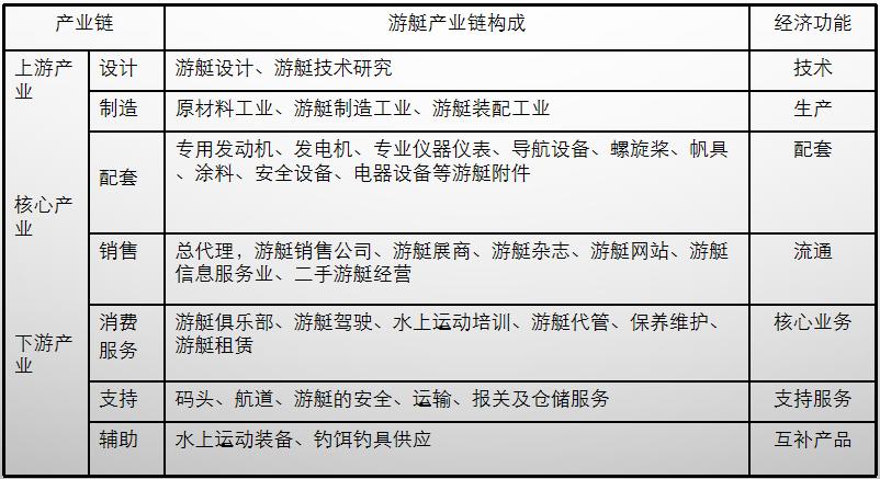 游艇產(chǎn)業(yè)價(jià)值鏈?zhǔn)怯稍O(shè)計(jì)、制造、銷售及消費(fèi)服務(wù)以及休閑旅游、維護(hù)保養(yǎng)和支持輔助等關(guān)聯(lián)產(chǎn)業(yè)共同組成的價(jià)值鏈條。游艇產(chǎn)業(yè)鏈上下游各環(huán)節(jié)之間存在著資金、信息和物質(zhì)的流動(dòng)和交換過程