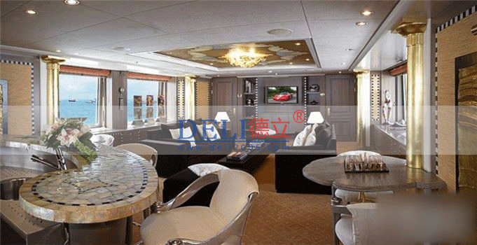 內(nèi)部客廳奢華時尚,兩側(cè)是大面積舷窗提供充足的采光,中央放有舒適的沙發(fā),造型奇特的茶幾增添一絲藝術(shù)的氣息。主臥寬敞舒適,放有一張大床,旁邊有儲物柜。