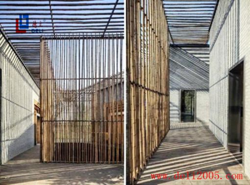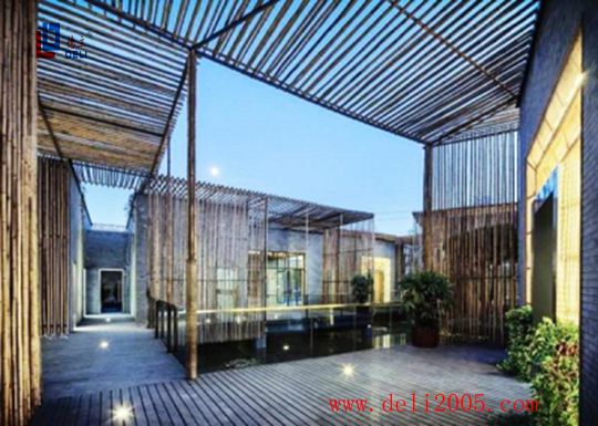 在遠離市區(qū)的生態(tài)公園里,建筑師臨水建起了一間竹院茶館。使用當?shù)氐拿駷橹饕牧?,在磚房和自然環(huán)境之間搭建出一個影影綽綽的過渡空間;人走在里面,就像行走在園林一樣、移步換景。竹院茶館獨特的建筑設計風格,在夜色中更顯得美輪美奐,燈光從茶室的竹墻間穿過,豎向線條更加明顯。