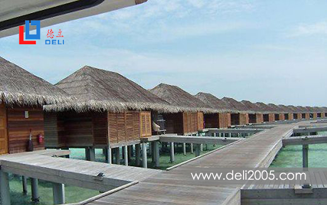 “水上木屋”蓋屋頂用的材料是棕櫚樹(shù)葉。由于棕櫚葉含有大量的膠質(zhì)且非常柔韌,用它做屋頂,除了蔭涼和居住舒適,還有耐鹽、耐堿、抗風(fēng)、防水、防蟲、防霉?fàn)€、不易燃燒的特點(diǎn)。在建房前,先將棕櫚葉采摘下來(lái)進(jìn)行挑選,然后曬干,再用它苫成厚厚的草簾,一層一層鋪在屋頂上。鋪好后,為防止棕櫚葉被風(fēng)吹掉,還要用結(jié)實(shí)的細(xì)繩在屋頂攔上幾道,進(jìn)行加固。