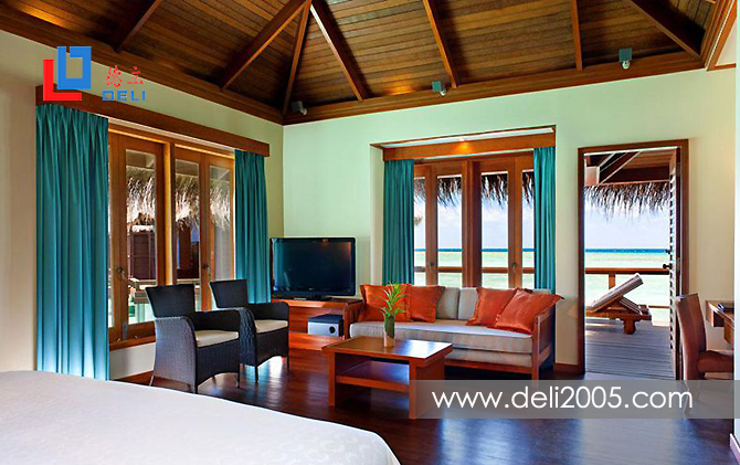 木屋外觀很漂亮,內(nèi)部裝飾也很有特點(diǎn)。室內(nèi)裝修都用木頭制作,臥具、書桌等都是用柚木特制的。臥室二面都是玻璃墻,使人有一種漂浮在大海上的感覺(jué)。在房間休息時(shí)你不用擔(dān)心海浪會(huì)吵醒你,因?yàn)榉块g密封很嚴(yán),基本上聽(tīng)不到外邊的聲音。當(dāng)然,如果想要伴著海浪入眠,就可開(kāi)窗睡了。