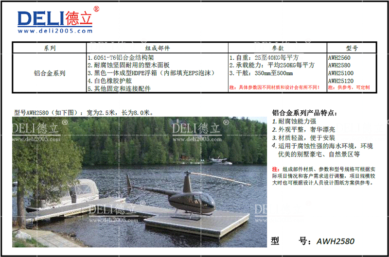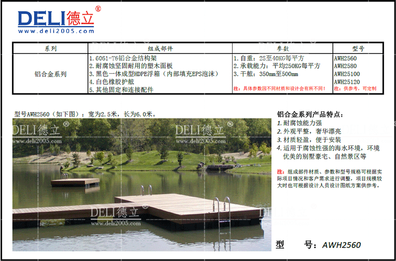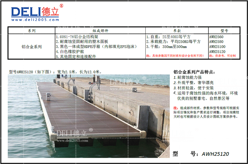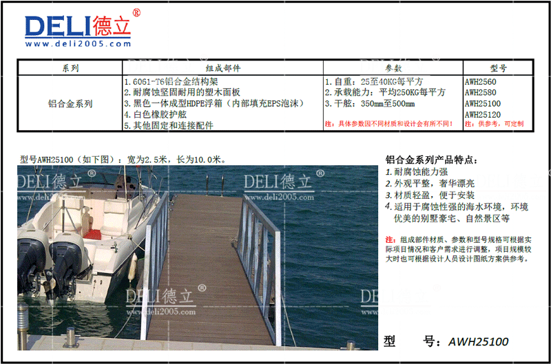 廣州德立游艇碼頭工程有限公司汲取國外鋁合金碼頭的成功經(jīng)驗,經(jīng)過多年技術(shù)攻關(guān),終于開發(fā)出了新型的鋁合金游艇碼頭。德立新型鋁合金游艇碼頭采用航海級的6061鋁合金,T6熱處理,MIG焊制而成,表面經(jīng)過科學(xué)的處理,增強了框架的抗氧化能力和抗腐蝕能力,可選用進口戶外防腐松木,塑木,菠蘿格作為鋪板材料。目前已出口沙特阿拉伯等國家。我司的鋁合金碼頭經(jīng)過嚴格測試,產(chǎn)品質(zhì)量已接近國外先進水準。