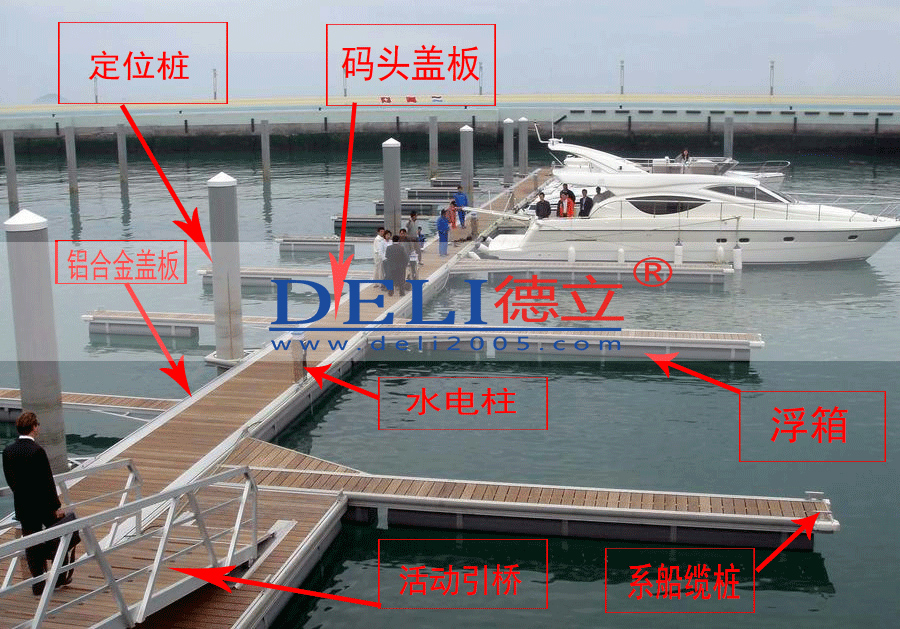 一、游艇碼頭主要由堤岸、固定斜坡、活動梯、主通道浮碼頭、支道浮動碼頭、定位樁、供水、供電系統(tǒng)、船舶、上下水斜道、吊升裝置等組成。