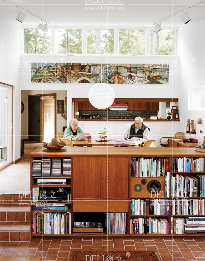 Peter Cohen做了將近50年的建筑師之后,他為自己和妻子Sally設(shè)計了一個新家,坐落在美國緬因州的埃爾斯沃思。夫妻兩人坐在餐廳,下邊就是客廳,上邊的窗戶是遙控的。