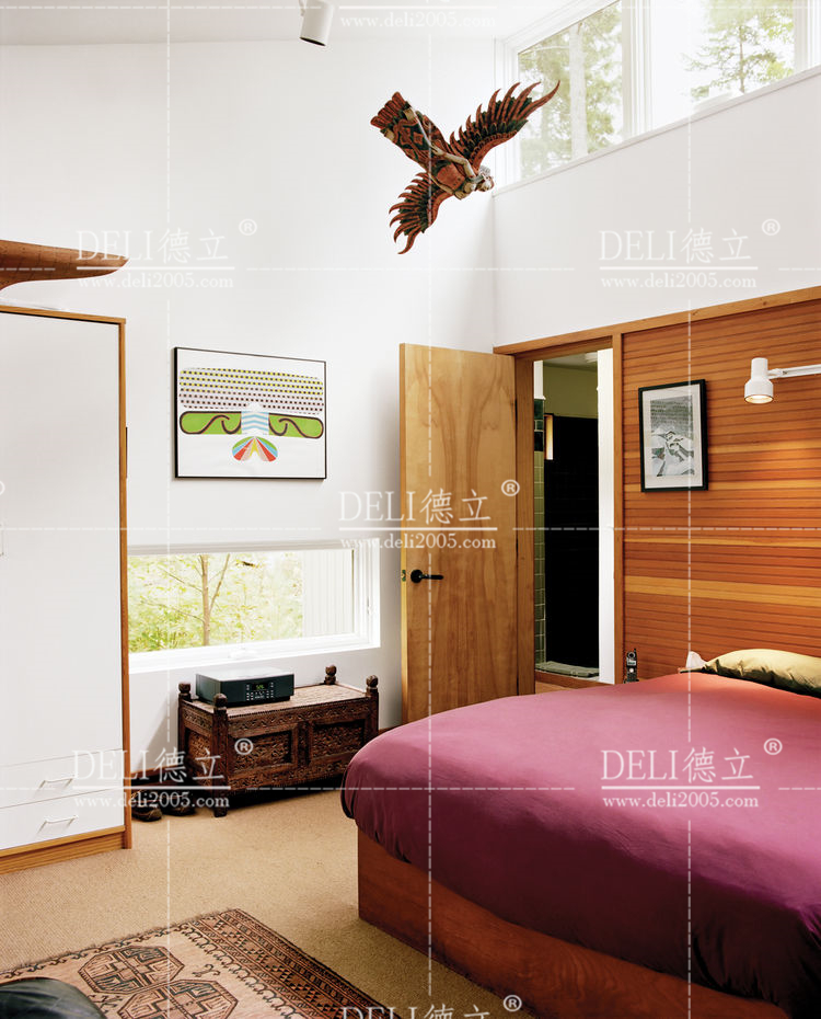 山坡下邊有一個河流,坐在戶外休閑區(qū)可以觀賞,戶外休閑區(qū)被設(shè)計在臥室和起居室之間,因為有角度,所以鄰居是看不到的。美國人有錢建鄉(xiāng)村別墅,跟中國有錢回老家自建房一樣一樣的。