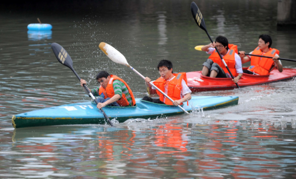 ③靜水競(jìng)速比賽。是運(yùn)動(dòng)員以盡可能短的時(shí)間劃過(guò)一段設(shè)有清晰標(biāo)志的無(wú)障礙的航道,是一項(xiàng)節(jié)奏性很強(qiáng)的力量性運(yùn)動(dòng)項(xiàng)目。規(guī)則規(guī)定皮艇只能用雙葉槳推進(jìn),因此是左右對(duì)稱地劃槳;而劃艇只能用單葉槳推進(jìn),因此是非對(duì)稱性劃槳。皮艇和劃艇的槳都不能以任何方式固定在艇上,運(yùn)動(dòng)員活動(dòng)自由度則不受限制。