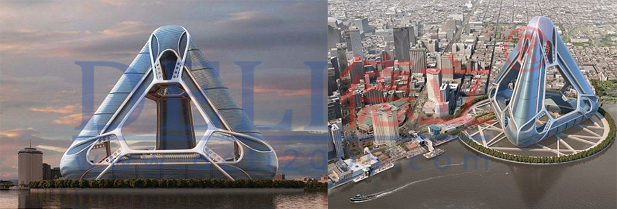 這種外形怪異的三角形建筑出自美國建筑師凱文•朔普費(fèi)爾之手,旨在把颶風(fēng)對(duì)建筑物的破壞降至最低值,設(shè)計(jì)靈感來源于如何避免2005年“卡特里娜”颶風(fēng)對(duì)美國新奧爾良市造成的巨大破壞。