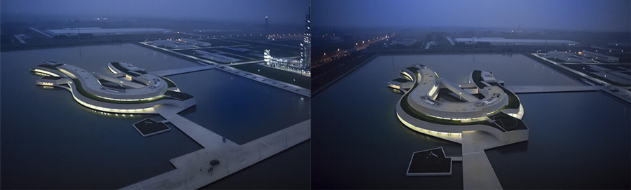 仿佛喚起一個(gè)栩栩如生的龍,優(yōu)雅地懸在水中,輪廓輕輕起伏。它的幾何形體和廠房的功能性矩形量體相互對(duì)應(yīng)。白色的弧線扭轉(zhuǎn),交替開闔,在水面環(huán)繞著特殊氣氛,形成詩(shī)意的景觀。不斷變化的色彩和水中的倒影不斷相互作用,或深淺不同的光線和陰影,使得建筑千變?nèi)f化。無(wú)論從地面、水面或空中視角,優(yōu)雅的建筑寧?kù)o的表達(dá)一個(gè)實(shí)體輕輕觸碰到一個(gè)虛體時(shí)所產(chǎn)生的美。