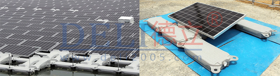 太陽(yáng)能電池板和接線盒利用樹脂制浮臺(tái)設(shè)置在水池上。浮臺(tái)是類似于竹筏的樹脂制部件,起著地上設(shè)置時(shí)使用的基礎(chǔ)和架臺(tái)的作用。