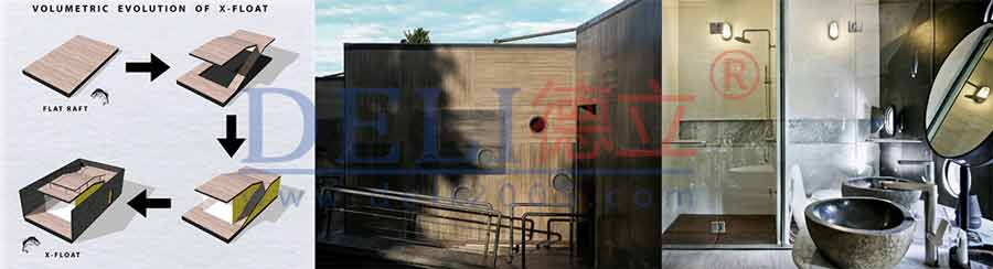 有人會質疑這樣的漂浮機制,會不會住在裡面,容易隨著潮汐漲退以及水流衝擊而頭暈不穩(wěn)。其實整體採輕鋼框架,再包覆纖維水泥牆板和膠合板,重量與浮力對應關系有經(jīng)過仔細計算,加上后方與陸地也有像泊船繩纜一樣的固定物,能夠確保最大程度的穩(wěn)固安全。