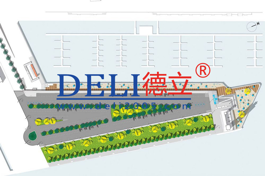 更讓人耳目一新的是優(yōu)雅的藍(lán)色沙灘傘、垂柳,色彩鮮艷的椅子和裝置、淋浴、木板路、柔滑的砂和點(diǎn)心站,給游客一個(gè)純粹的懶惰時(shí)刻。第二部分是停車(chē)場(chǎng),由一排樹(shù)組成,清晰再現(xiàn)了碼頭的三角形布局。由地表水徑流、落葉松、柳樹(shù)、灌木和多年生植被,增加綠色空間的氣氛。