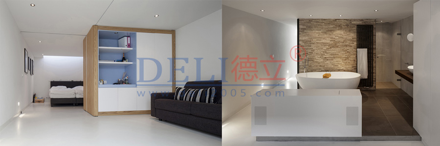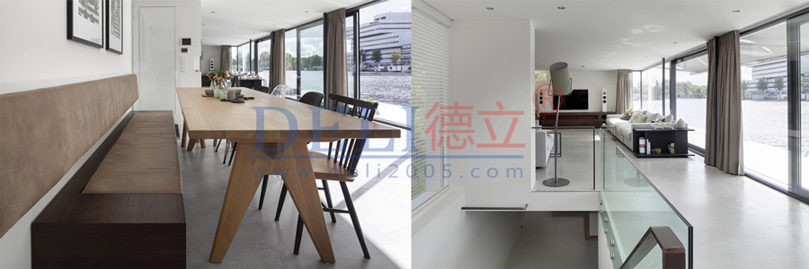 大型推拉門向室外露臺打開就可以顯現(xiàn)其水邊的地理環(huán)境,讓室內(nèi)與室外無縫對接。樓上與一部“漂浮”的樓梯相連,令懸空的視覺戲劇性繼續(xù)向下延續(xù),這種做法讓室內(nèi)顯得更寬敞。現(xiàn)代風(fēng)格的裝飾被整合在一起,以進(jìn)一步提高的生活空間。