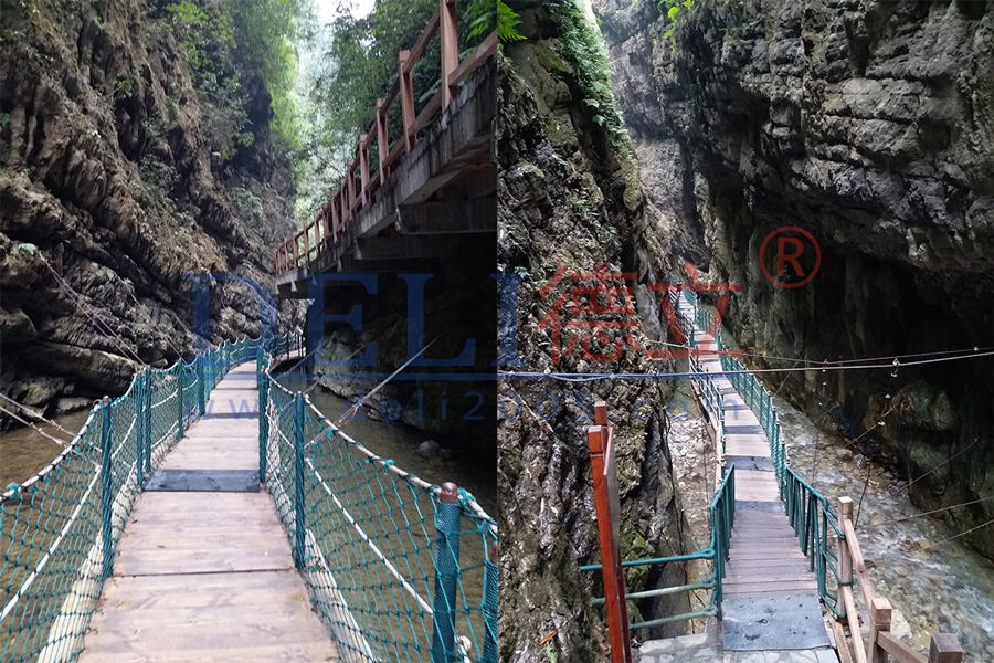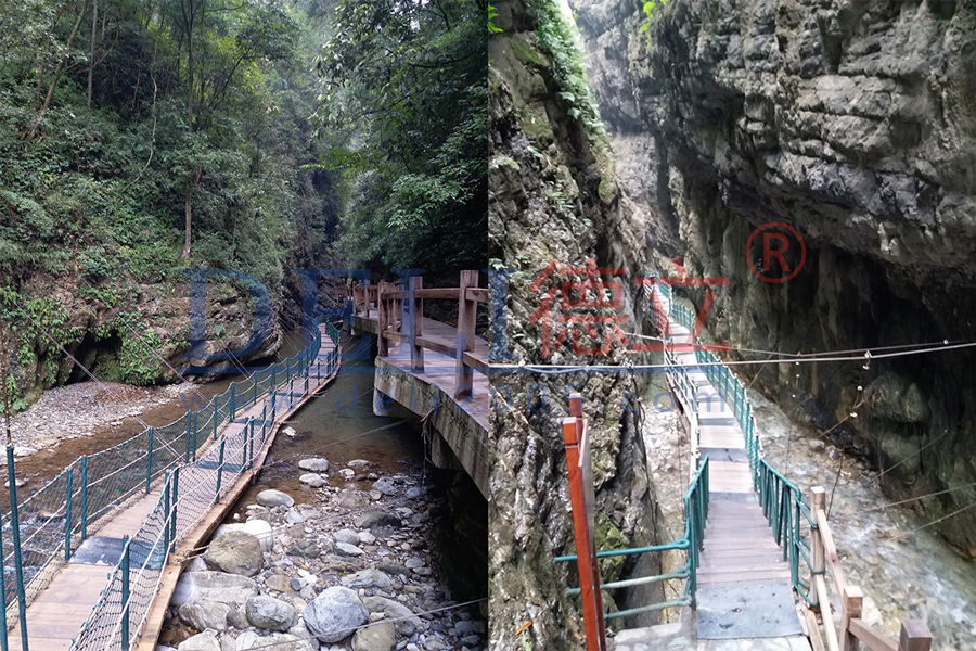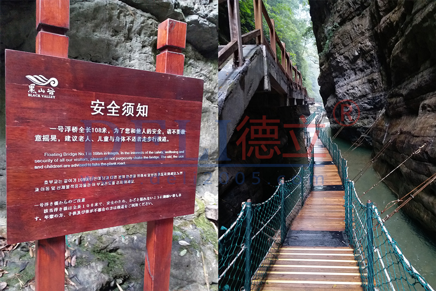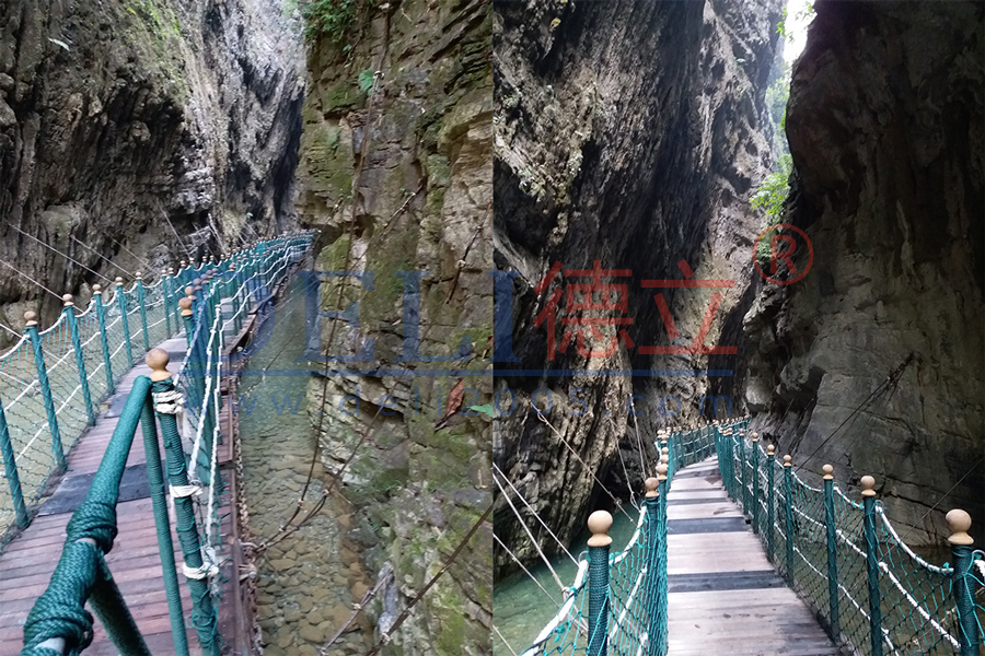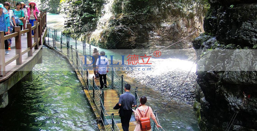 重慶萬(wàn)盛黑山谷浮橋,中國(guó)第一個(gè)正式設(shè)計(jì)施工的峽谷浮橋,該工程極具挑戰(zhàn)性,河谷兩岸谷坡陡直,坡度一般在70―80度,部分岸坡直立在90度以上,高在1200米左右,其中,魚(yú)跳峽、野豬峽、猴跳峽,最寬不足10米。德立公司克服了種種問(wèn)題,于2005年底順利完工,得到了業(yè)主的絕對(duì)肯定。如今工程完工至今,已接10年多的時(shí)間了,留著我們的仍是當(dāng)初那一幅自然,靈動(dòng),融入山水之中的畫(huà),為“中國(guó)最美養(yǎng)生峽谷”增添了濃重的一筆。德立公司始終以?xún)?yōu)質(zhì)的工程,良好的服務(wù)以及后期跟進(jìn)而服務(wù)于客戶(hù)。這次公司走訪(fǎng)了重慶萬(wàn)盛黑山谷,得到了客戶(hù)的熱烈接待,為今后的合作奠定更加堅(jiān)實(shí)的基礎(chǔ),同時(shí)為以后建立長(zhǎng)期的合作關(guān)系。