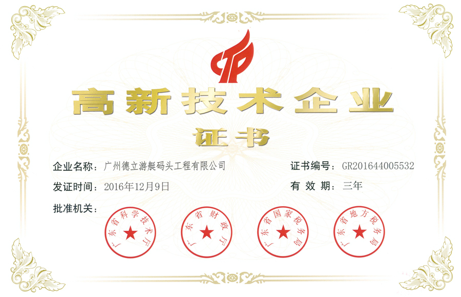 借此,祝賀公司成為游艇碼頭、浮橋、水上建筑行業(yè)內(nèi)唯一通過“高新技術(shù)企業(yè)”驗證的企業(yè)。我們愿意并竭力讓每一個客戶在德立產(chǎn)品中獲取最大效益;我們愿意并竭力讓每一個用戶在使用德立產(chǎn)品中得到最好的質(zhì)量保證!