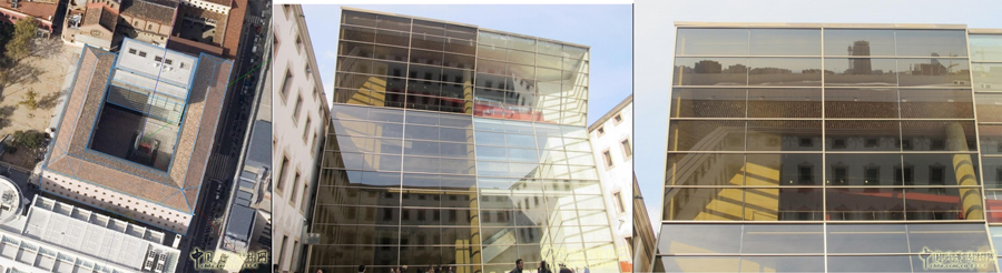 Richord Meier被市長(zhǎng)邀請(qǐng)過(guò)來(lái),對(duì)老城做一個(gè)改變,他在對(duì)于老城區(qū)的設(shè)計(jì)中完全加入了自己的語(yǔ)言,這是他對(duì)這個(gè)城市進(jìn)行的回應(yīng)。他騰出很大的空間,做了一個(gè)非常浪費(fèi)空間的中庭,這個(gè)中庭對(duì)應(yīng)于南部的城市的小廣場(chǎng),這也是整個(gè)建筑最讓人興奮之處。不過(guò)這一點(diǎn)點(diǎn)對(duì)于城市的妥協(xié),在教授眼里是不值得一提的,后來(lái)我們漸漸明白過(guò)來(lái)了。他給我們舉了例子,非常有趣的是在他的旁邊,這是老城,還是原來(lái)那個(gè)肌理,中世紀(jì)老城的面貌,在北側(cè)還有一個(gè)建筑,是當(dāng)代的建筑,非常有名的在巴塞羅那的案例。其中在Meier靠著的墻根的北邊,做了一個(gè)文化的模板,當(dāng)代文化藝術(shù)中心(CCCB),這個(gè)建筑體現(xiàn)出跟Meier完全不同的概念。