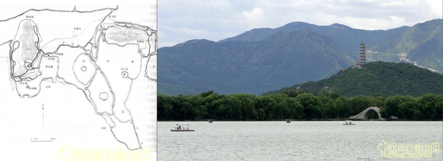 這個(gè)案例也提一下,它的氣場(chǎng)是玉泉山、香山的脈絡(luò),它希望跟外頭有一個(gè)關(guān)聯(lián),希望去借題發(fā)揮。我們說(shuō)借景其實(shí)很多,在《園冶》里邊一大段,孟先生也是這方面的一個(gè)大師。在這可以讓你脫出非常狹隘的概念去對(duì)待這個(gè)場(chǎng)面,我們可以看到非常多的借,這是一個(gè)借的概念。