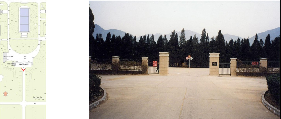 我們可以看到原來(lái)的格局,原來(lái)場(chǎng)地中的價(jià)值,這些價(jià)值還不只是要素的價(jià)值,它是作為結(jié)構(gòu)的價(jià)值。這是2號(hào)門,3號(hào)門、4號(hào)門,里面還有點(diǎn)景樹,這些點(diǎn)景樹在控制節(jié)奏的布局中也是非常重要的,這是《在那遙遠(yuǎn)的地方》銘刻在這兒的歌詞。這部分是剛植的樹,大概快三年了,現(xiàn)在已經(jīng)死了一半,所以說(shuō)這里是樹木很難存活的地方。我們?cè)賮?lái)看一下前后的對(duì)比,可以看到這個(gè)價(jià)值是隱藏在這個(gè)點(diǎn)里的,是對(duì)應(yīng)的關(guān)系。我覺得設(shè)計(jì)師如果借題發(fā)揮,應(yīng)該是能夠讀出來(lái)的。