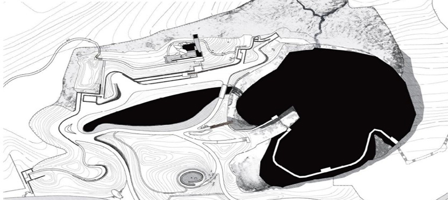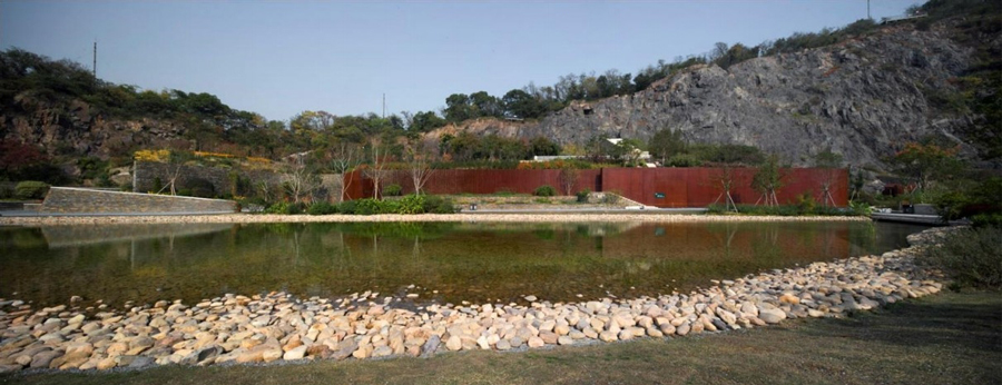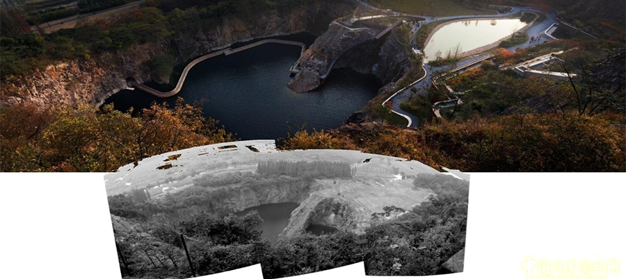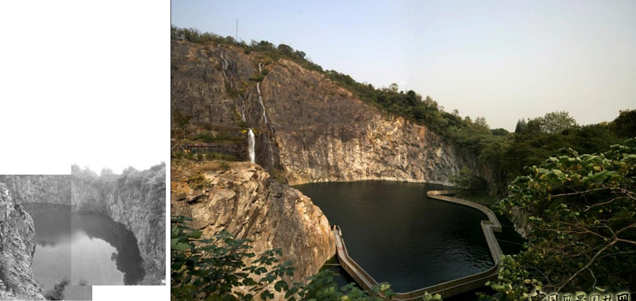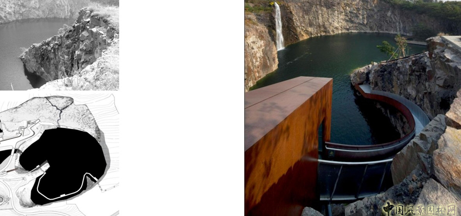 這是上海辰山的植物園,我受邀對(duì)它的西礦坑進(jìn)行獨(dú)立設(shè)計(jì)。因?yàn)槌缴接芯艂€(gè)峰,這里面是軍區(qū)的,后來(lái)做了兩平方公里的規(guī)劃。之所以請(qǐng)我過(guò)來(lái),其中一個(gè)原因是需要讓這個(gè)場(chǎng)地的特性充分的激活出來(lái)。這是原來(lái)在場(chǎng)地中的圖片,李安《色戒》在這兒拍的槍斃的鏡頭,場(chǎng)地很難用美麗來(lái)形容,我覺得它是兇險(xiǎn)的,其實(shí)我們風(fēng)景園林設(shè)計(jì)會(huì)面臨更多的這樣的問(wèn)題,你需要進(jìn)行轉(zhuǎn)化,如何把丑陋的東西或者貌似丑陋的東西,激活它的潛在價(jià)值。我們可以看到這樣的場(chǎng)地,下面還有30多米的坡道,平臺(tái)這個(gè)區(qū)是5米,里面有好多軍用通道,這還是軍管的,不可以賣給甲方,還留有軍方的通道。坡道是近似于60度的一個(gè)坡道。