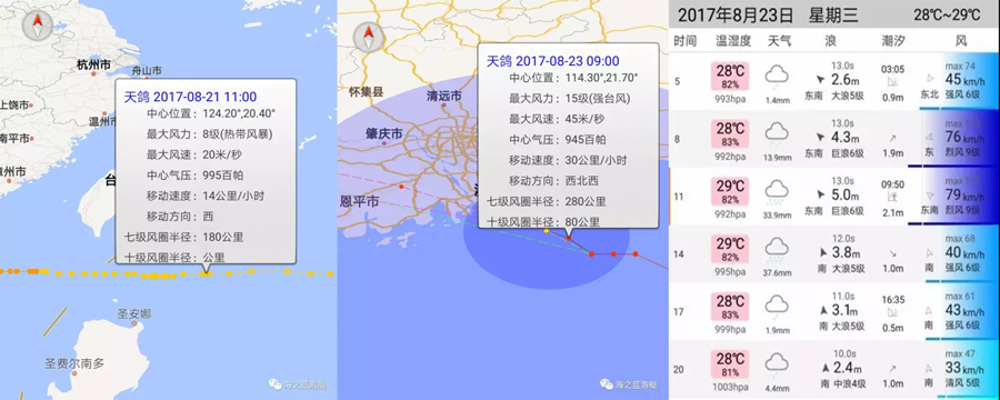 8月23號(hào)早上,小編查看了各個(gè)游艇會(huì)的海浪潮汐天氣預(yù)報(bào),不看不知道,一看嚇一跳,惠州巽寮灣游艇會(huì),將可能迎來(lái)6米的巨浪;而大鵬的幾個(gè)游艇會(huì),也可能迎來(lái)5米的巨浪和大風(fēng);珠江海域的游艇會(huì),深圳灣也有可能迎來(lái)5米巨浪,同時(shí)將有9級(jí)的烈風(fēng);而南沙游艇會(huì)與深圳機(jī)場(chǎng)鴻洲國(guó)際游艇會(huì)相對(duì)好點(diǎn),但也將有4米左右的大浪和8級(jí)的大風(fēng);而受到正面襲擊的珠海、中山,將可能受到10級(jí)以上的狂風(fēng)襲擊。通過(guò)查看潮汐表看到,8月23日剛好是本月的大潮汛期,高潮時(shí)間將分別從10-11點(diǎn)之間,從對(duì)“天鴿”的預(yù)報(bào)看,臺(tái)風(fēng)將在12-13點(diǎn)左右,可能在珠海與陽(yáng)江之間登錄,而天鴿最接近深圳的時(shí)間在11點(diǎn)左右,也將是高潮的時(shí)間,這對(duì)于深圳、珠海等游艇會(huì)將是一場(chǎng)嚴(yán)峻的考驗(yàn)。