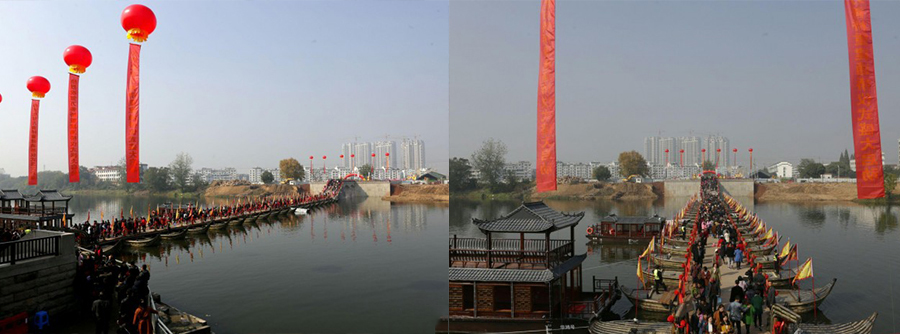 在義烏市佛堂鎮(zhèn)舉辦的“十月十”民俗文化節(jié)上,義烏江上首座由眾多民間人士籌資重建的大橋---“萬善浮橋”28日將開始恢復(fù)重建后的試通行,這里成了眾多游客的最大熱點,紛紛有序排起了長隊一一上橋體驗并爭睹芳容。重建后的浮橋, 橋長130米,寬4.5米,由20艘木船連接而成。一頭倚著挽瀾亭,一頭連接著江北的古民居苑,這既是游客從江北通往古鎮(zhèn)的主入口、古鎮(zhèn)“一江兩岸三橋”規(guī)劃的核心,也是聯(lián)接江南、江北的一道靚麗風(fēng)景。