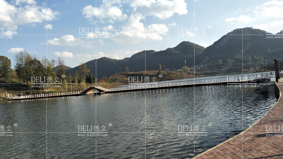 該景觀浮橋位于水城縣雙水新區(qū)東部國際城,水城縣位于貴州省西部,地處中國涼都六盤水市;氣候溫和,冬無嚴(yán)寒,夏無酷暑,水城境內(nèi)山巒起伏,自然景觀較多。明硐湖景觀浮橋?qū)儆趩慰赘」皹颍煨蛢?yōu)美。
