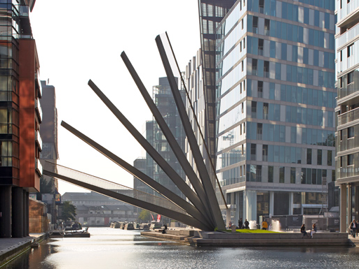 在英國倫敦的商業(yè)廣場,由knight建筑事務(wù)所設(shè)計(jì)的一座可移動(dòng)的人行橋已向公眾開放。這座人行天橋位于帕丁頓運(yùn)河一個(gè)混合用途的濱水區(qū),其結(jié)構(gòu)由結(jié)構(gòu)工程師AKT II設(shè)計(jì)。這座懸臂式跨度20米的人行橋橫亙在大聯(lián)盟運(yùn)河上并與對(duì)岸相連。人行橋使用了液壓千斤頂,被設(shè)想成一個(gè)動(dòng)感雕塑,猶如日本傳統(tǒng)折扇那樣打開。