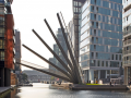 甲板的結(jié)構(gòu)由五條裝配式的鋼梁組成,可以按交錯(cuò)的順序升起來實(shí)現(xiàn)在運(yùn)河上所需的凈空高度。這座人行橋使用了液壓千斤頂,被設(shè)想成一個(gè)動(dòng)感雕塑。這座橋成為了該區(qū)域再生的一部分,這個(gè)大尺度的項(xiàng)目包括在水邊廣場周圍新建六座建筑。