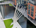 該項(xiàng)目背后的開發(fā)者,歐洲土地的執(zhí)行總裁理查德.班克斯說:“這座橋是這個(gè)商業(yè)廣場建成環(huán)境的關(guān)鍵要素,因此,橫亙在大聯(lián)盟運(yùn)河上的新人行橋增強(qiáng)了該區(qū)域的公共性,它不僅實(shí)用也很美觀。” Knight建筑事務(wù)所采用垂直位移實(shí)現(xiàn)了這個(gè)設(shè)計(jì),創(chuàng)造了一座識(shí)別性強(qiáng),引人注目的人行橋。