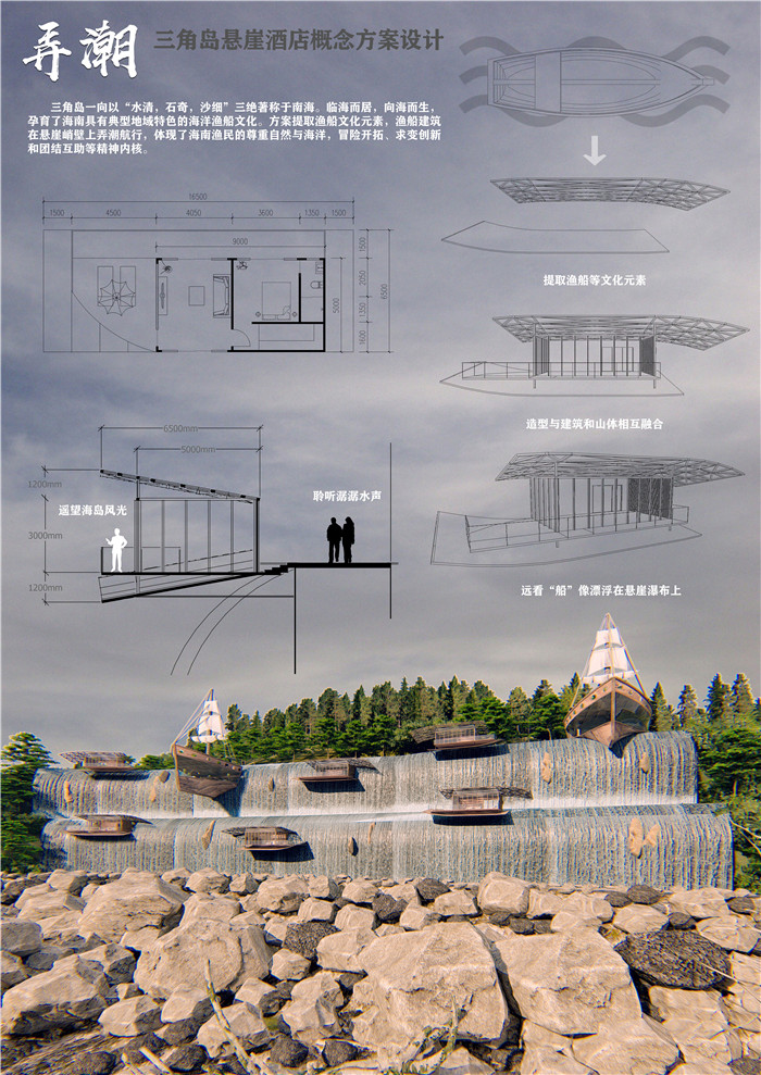 三角島一向以“水清,石奇,沙細”三絕著稱于南海。臨海而居,向海而生,孕育了海南具有典型地域特色的海洋漁船文化。我司設計師方案提取漁船文化元素,漁船建筑在懸崖峭壁上弄潮航行,體現(xiàn)了海南漁民的尊重自然與海洋,冒險開拓、求變創(chuàng)新和團結互助等精神內核。